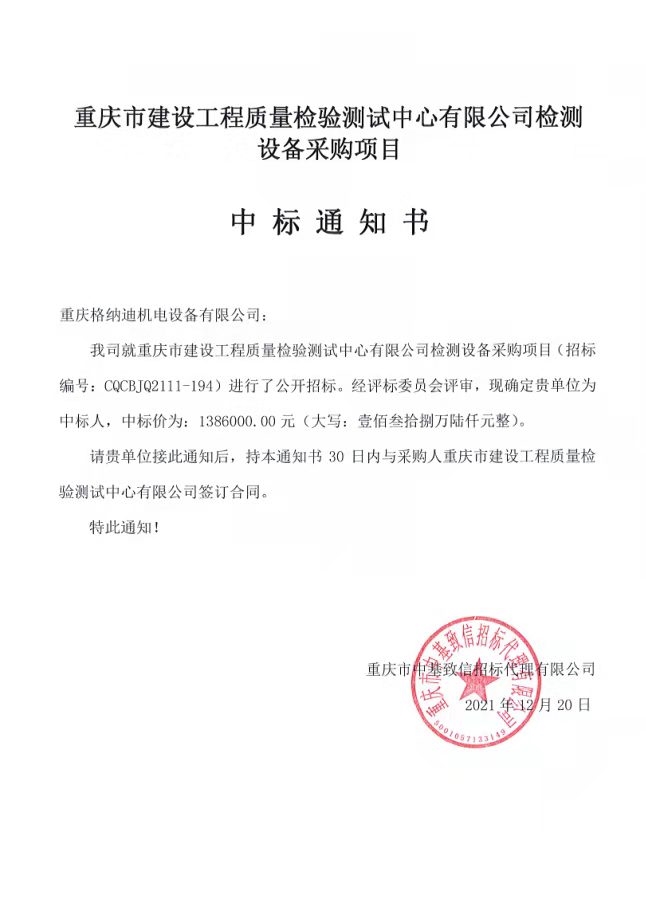 重慶市建設(shè)工程質(zhì)量檢驗(yàn)測(cè)試中心有限公司委托重慶市中基致信招標(biāo)代理有限公司對(duì)我公司檢測(cè)設(shè)備采購(gòu)項(xiàng)目(項(xiàng)目號(hào):CQCBJQ2111-194 )進(jìn)行公開(kāi)招標(biāo)采購(gòu),現(xiàn)已完成全部采購(gòu)程序,確認(rèn)重慶格納迪機(jī)電設(shè)備有限公司為中標(biāo)人,中標(biāo)價(jià)為1386000元(壹佰參拾捌萬(wàn)陸仟佰元整)。