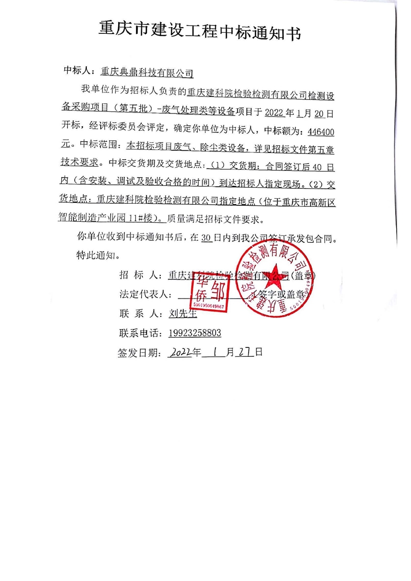 重慶建科院檢驗(yàn)檢測有限公司委托重慶市工程管理有限公司對我公司檢測設(shè)備采購項(xiàng)目(項(xiàng)目號:CQEM-ZB-22002 )重慶建科院檢驗(yàn)檢測有限公司檢測設(shè)備采購項(xiàng)目(第五批)-廢氣處理類等設(shè)備進(jìn)行了公開招標(biāo)采購,現(xiàn)已完成全部采購程序。確認(rèn)重慶典鼎科技有限公司為檢測設(shè)備采購項(xiàng)目(第五批)-廢氣處理類等設(shè)備采購項(xiàng)目中標(biāo)人,中標(biāo)價(jià)為446400元(大寫:肆拾肆萬陸仟肆佰元整)。