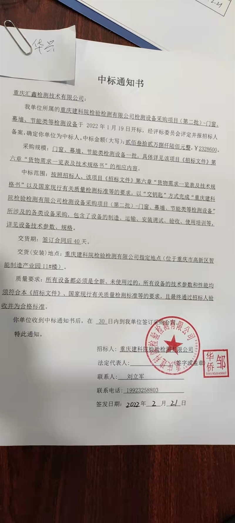 重慶建科院檢驗(yàn)檢測(cè)有限公司委托重慶華興工程咨詢有限公司對(duì)我公司檢測(cè)設(shè)備采購(gòu)項(xiàng)目(項(xiàng)目號(hào):HXZX-2021-30 )重慶建科院檢驗(yàn)檢測(cè)有限公司檢測(cè)設(shè)備(第二批)-門(mén)窗、幕墻、節(jié)能類等檢測(cè)設(shè)備進(jìn)行了公開(kāi)招標(biāo)采購(gòu),現(xiàn)已完成全部采購(gòu)程序。確認(rèn)重慶匯鑫檢測(cè)技術(shù)有限公司為檢測(cè)設(shè)備(第二批)-門(mén)窗、幕墻、節(jié)能類等檢測(cè)設(shè)備采購(gòu)項(xiàng)目中標(biāo)人,中標(biāo)價(jià)為2328600元(大寫(xiě):貳佰叁拾貳萬(wàn)捌仟陸佰元整)。