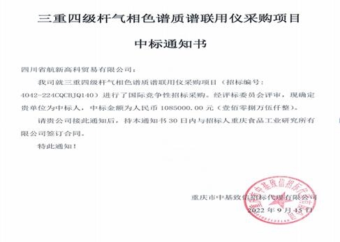 重慶食品工業(yè)研究所有限公司委托重慶市中基致信招標(biāo)代理有限公司對三重四級桿氣相色譜質(zhì)譜聯(lián)用儀采購項目(招標(biāo)編號:4042-224CQCBJQ140)進(jìn)行國際競爭性招標(biāo)采購,現(xiàn)已完成全部采購程序。確定中標(biāo)人四川省航新高科貿(mào)易有限公司,中標(biāo)金額為人民幣1085000.00元(壹佰零捌萬伍仟整)。