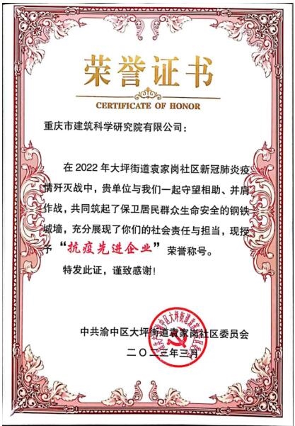3月23日,大坪街道召開“疫”路有你,與愛同行——暨抗疫“最美黨員”表彰大會(huì),為在2022年大坪街道袁家崗社區(qū)新冠肺炎疫情殲滅戰(zhàn)中表現(xiàn)優(yōu)秀的社會(huì)團(tuán)體與個(gè)人頒發(fā)榮譽(yù)證書,市建科院公司獲“抗疫先進(jìn)企業(yè)”榮譽(yù)稱號(hào)。