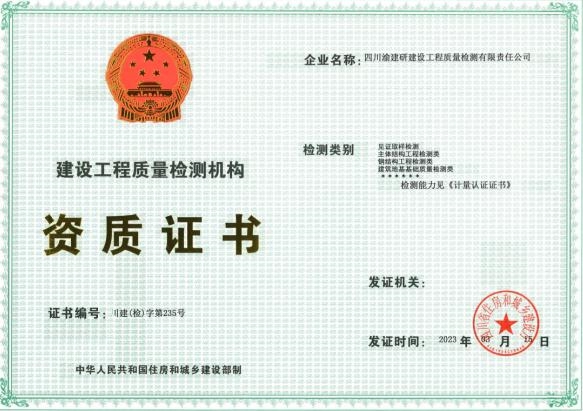 近日,經四川省住房和城鄉(xiāng)建設廳核準,重慶設計集團市建科院所屬子企業(yè)四川渝建研建設工程質量檢測有限責任公司(以下簡稱“渝建研”)申請重新核定的建設工程質量檢測機構資質于2023年3月成功獲批并順利取證。
