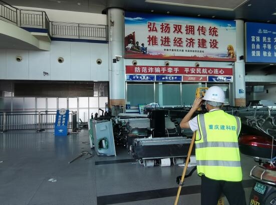 由于時(shí)間緊、任務(wù)重,為保證萬州五橋機(jī)場(chǎng)T1航站樓改造升級(jí)后續(xù)工作順利推進(jìn),市建科院公司接到委托后立即組織了在檢測(cè)、鑒定領(lǐng)域具有豐富經(jīng)驗(yàn)的專家及檢測(cè)人員進(jìn)駐現(xiàn)場(chǎng)進(jìn)行檢測(cè)。檢測(cè)人員嚴(yán)格按照相關(guān)規(guī)范的要求,充分考慮現(xiàn)場(chǎng)檢測(cè)的客觀條件,編制了詳盡的檢測(cè)方案,于2023年8月29日開始現(xiàn)場(chǎng)檢測(cè)。在所有檢測(cè)人員的共同努力下,于8月31日如期完成了現(xiàn)場(chǎng)檢測(cè)工作,形成的檢測(cè)、鑒定報(bào)告為后續(xù)改造設(shè)計(jì)提供了依據(jù)。