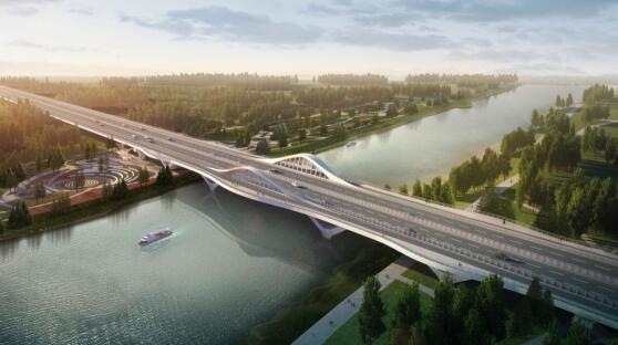 安運橋主橋設(shè)計采用梁-拱型組合體系,立意“荷香”,將荷葉形態(tài)融入到橋梁造型當(dāng)中,荷葉浮于運河之上,整個造型宛如運河上盛開的荷花,生態(tài)自然,與環(huán)境融為一體,給人以生機(jī)盎然、自然和諧的美感。