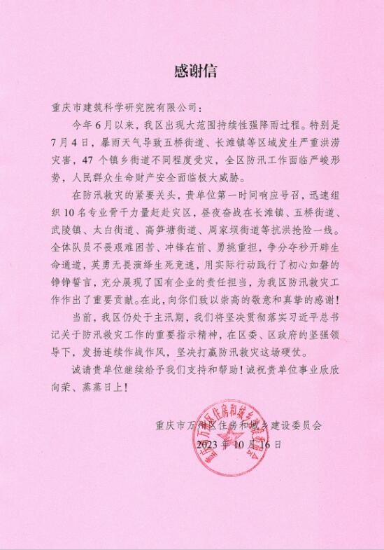 近日,重慶市建筑科學研究院有限公司收到來自重慶市萬州區(qū)住房和城鄉(xiāng)建設委員會的感謝信,信中對市建科院在今年7月萬州暴雨災后防汛救災工作中所做出的貢獻致以敬意和感謝。