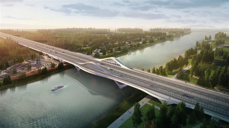 主橋設(shè)計(jì)采用梁-拱型組合體系,立意“荷香”,將荷葉形態(tài)融入到橋梁造型當(dāng)中,荷葉浮于運(yùn)河之上,整個(gè)造型宛如運(yùn)河上盛開的荷花,生態(tài)自然,與環(huán)境融為一體,給人以生機(jī)盎然、自然和諧的美感。